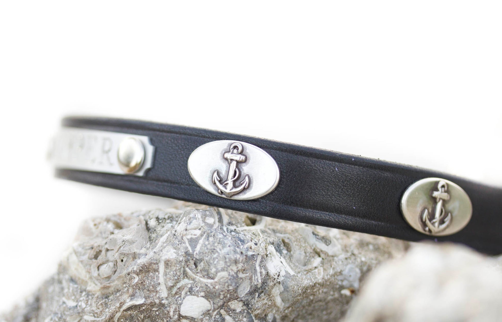 This beautiful 3/4 inch wide collar is a soft leather that gets even softer the more it is used:-) If you love nautical, you will this design with the anchor conchos on each side of the name plate.