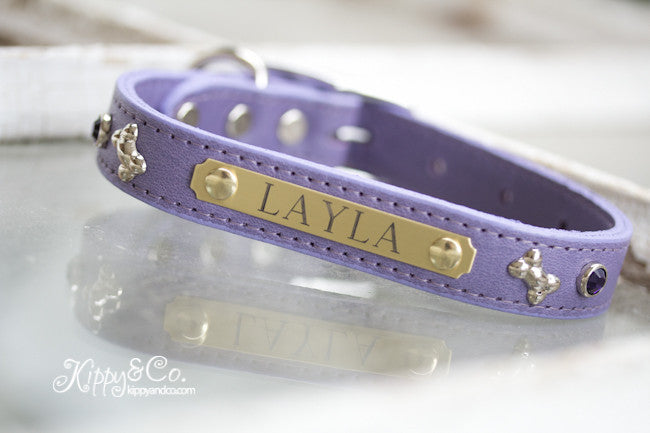 This Personalized Leather Bone Crystal Dog Collar is 3/4 inch wide and we have totally rocked it out!!! The beautiful brass name plate gives you the personalized custom collar your dog deserves! On each side we have a silver bone and a purple velvet swarovski crystal.