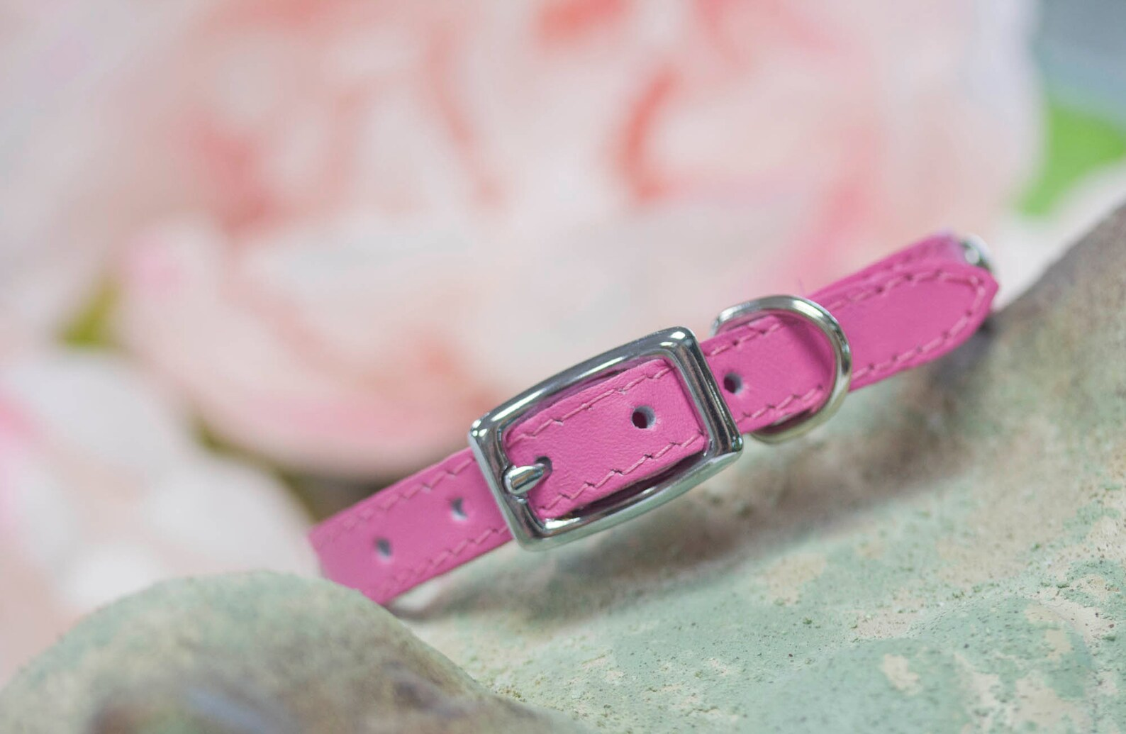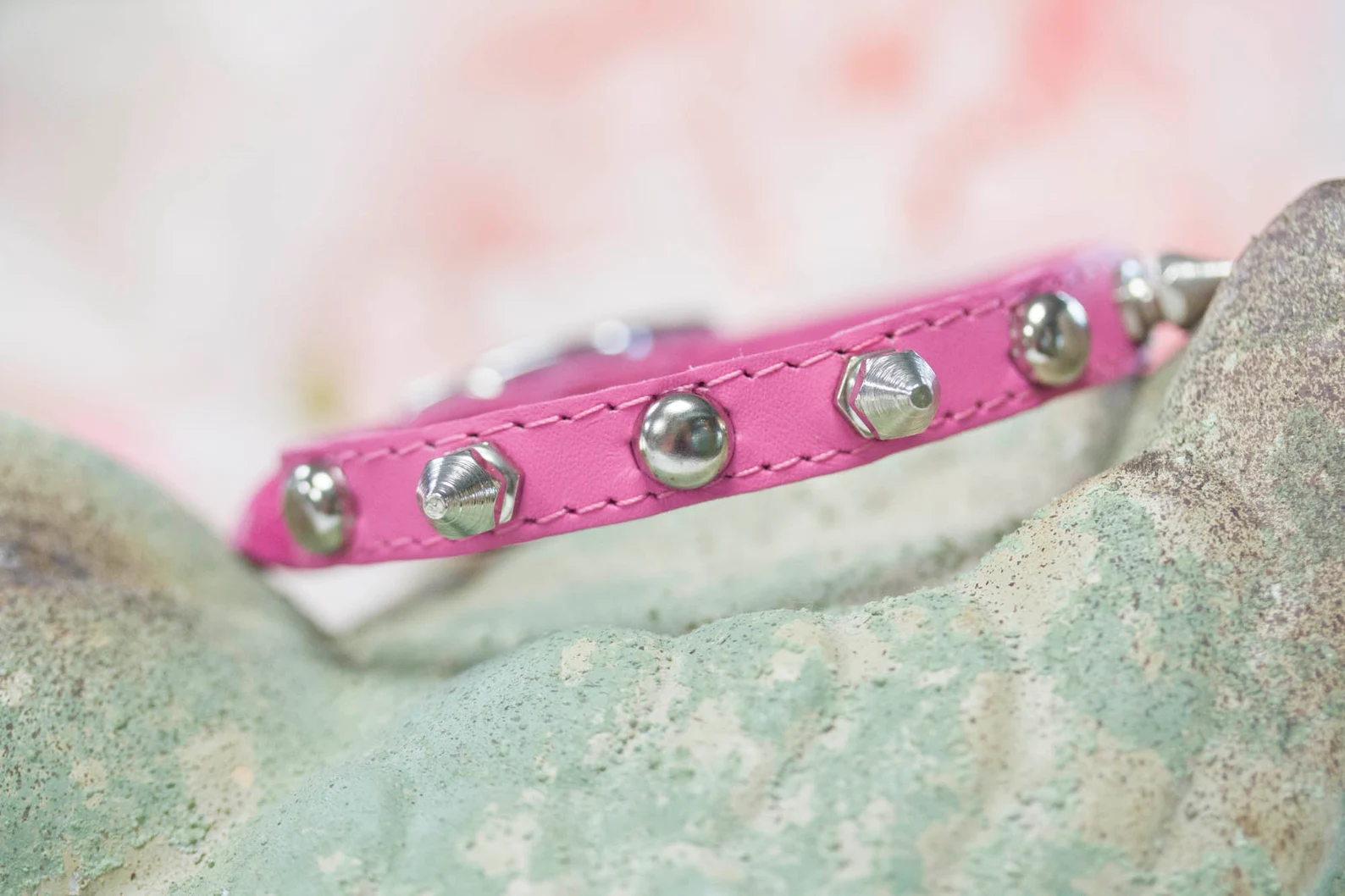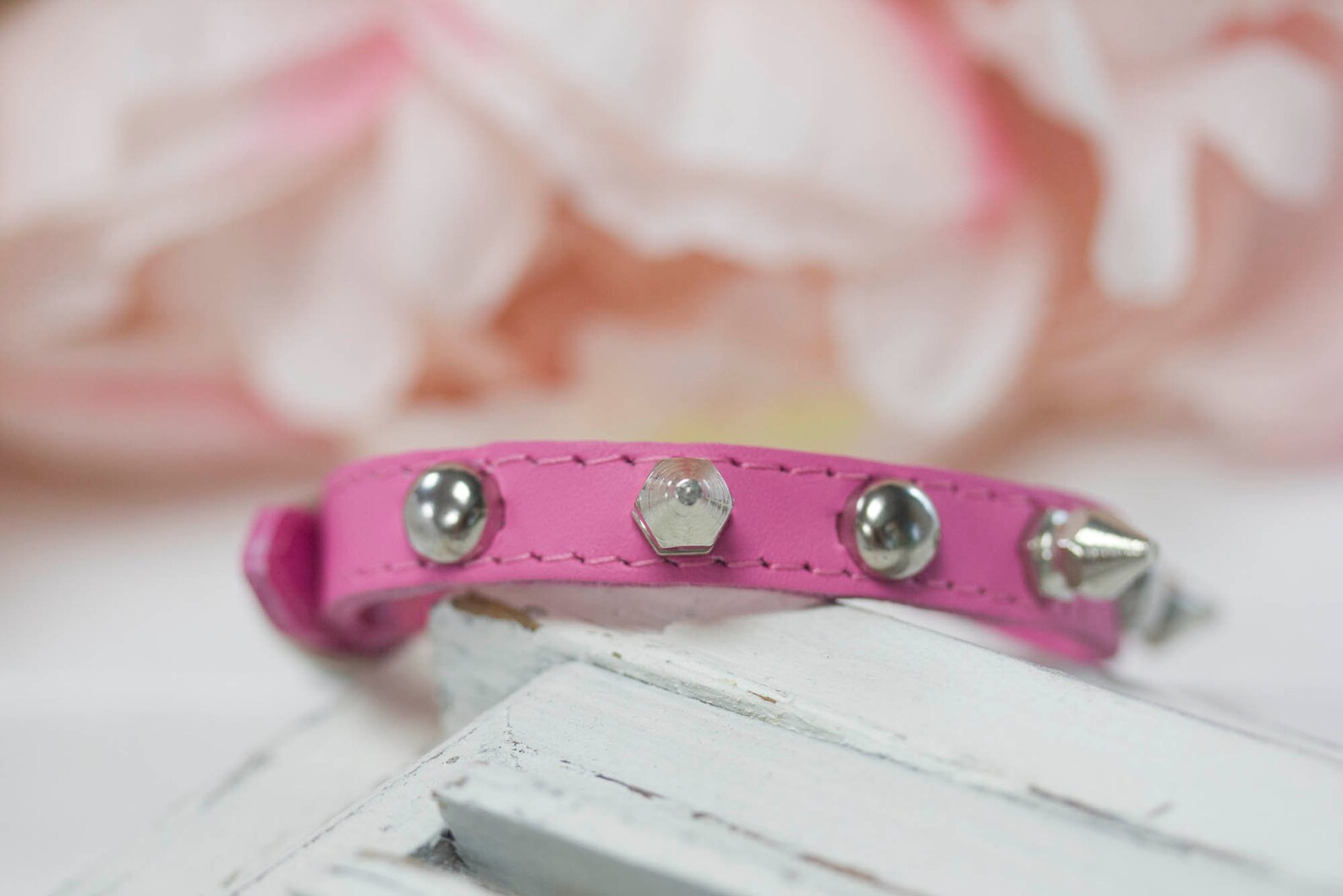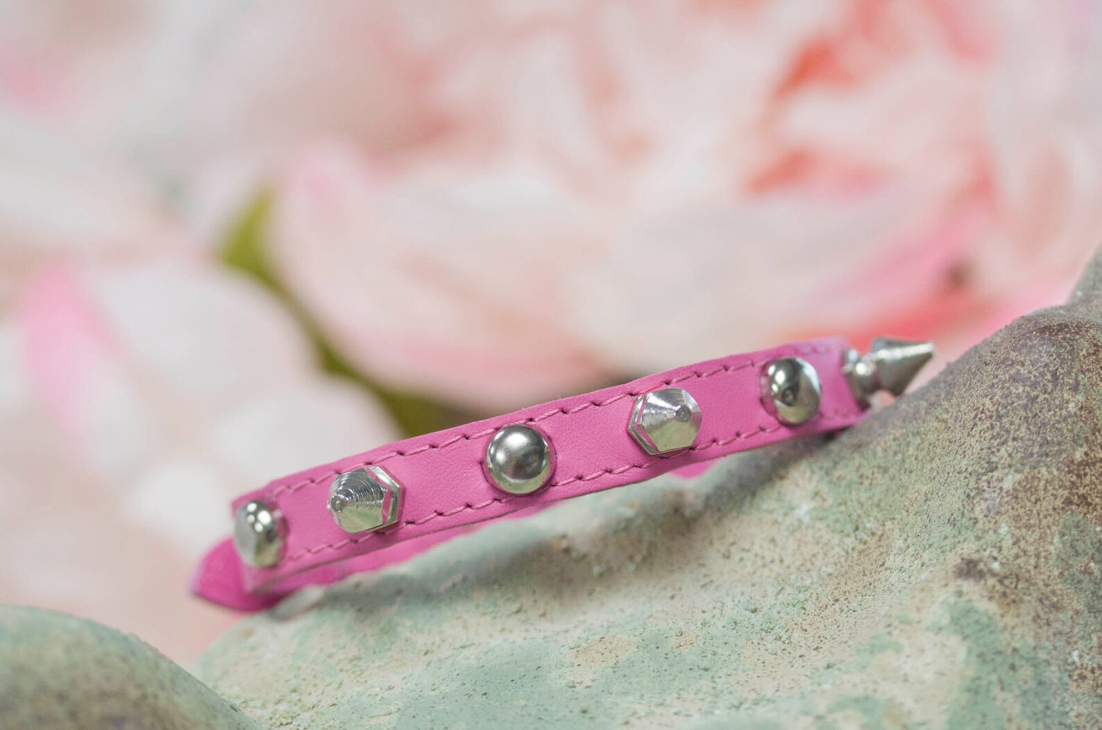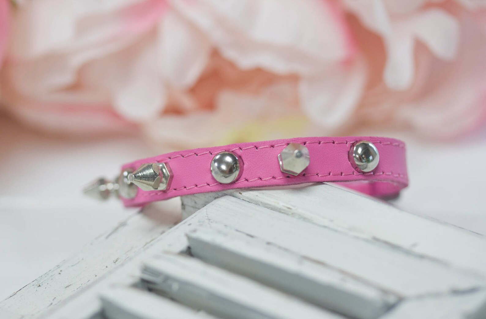 Tiny spike leather collar for the tea cup size dog!!! The spikes are accented with nickel dome studs. This Tiny Leather Dog collar is soft and lightweight. An absolute must for your fur baby! It is genuine leather and all hand made in the USA!